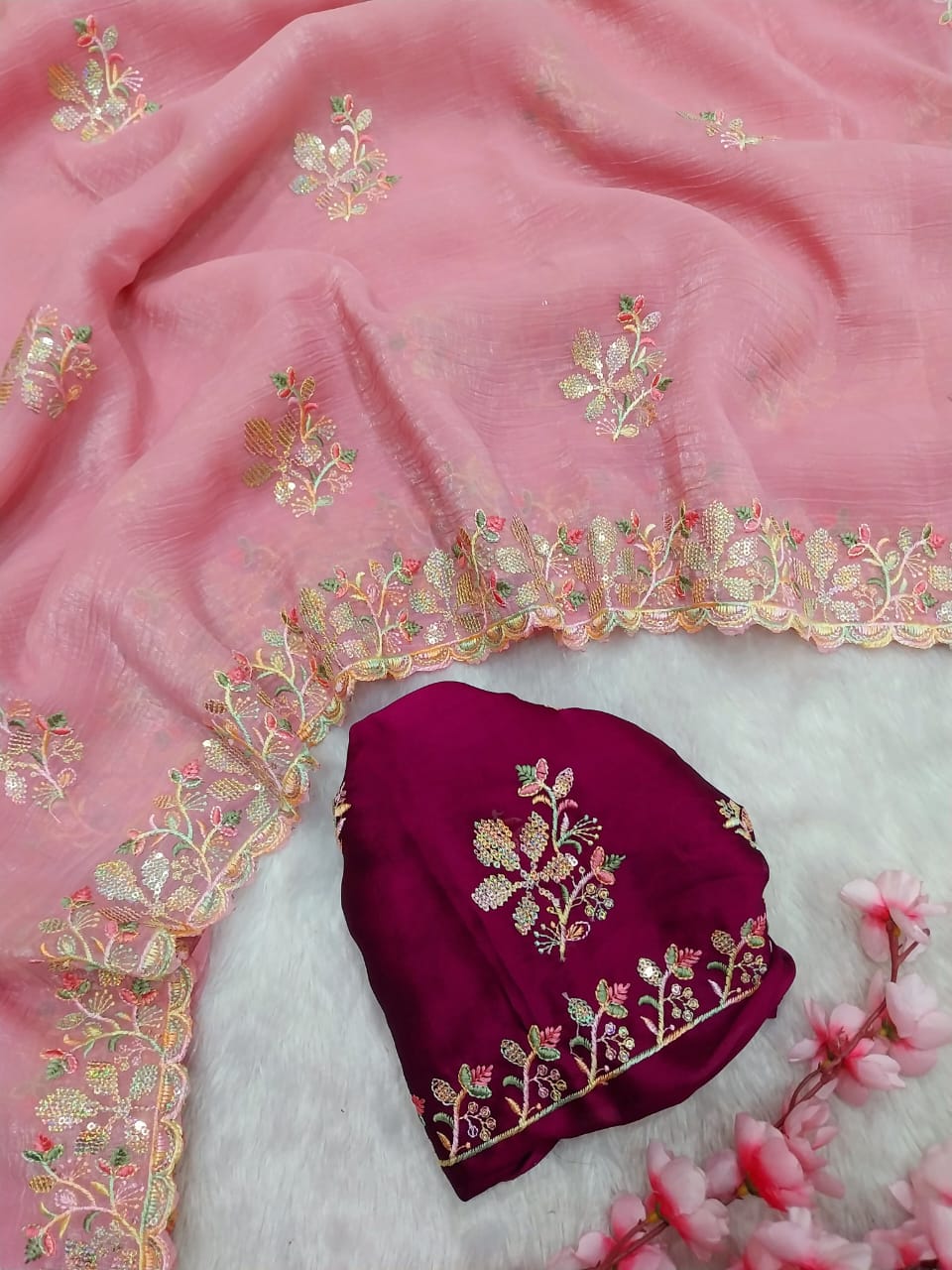 Step into a world of subtle elegance with the NF 708 Delicate Pink Embellished Saree. This beautiful saree features a soft, dreamy pink hue, perfect for a gentle and graceful look. The intricate floral embellishments along the border and scattered motifs add a touch of sparkle and refined detail. The lightweight fabric ensures a comfortable and flowing drape, making it ideal for festive occasions, daytime events, and special gatherings. The saree comes with a contrasting maroon blouse piece, creating a stunning and coordinated ensemble. Embrace a blend of feminine charm and exquisite craftsmanship with this lovely pink saree.