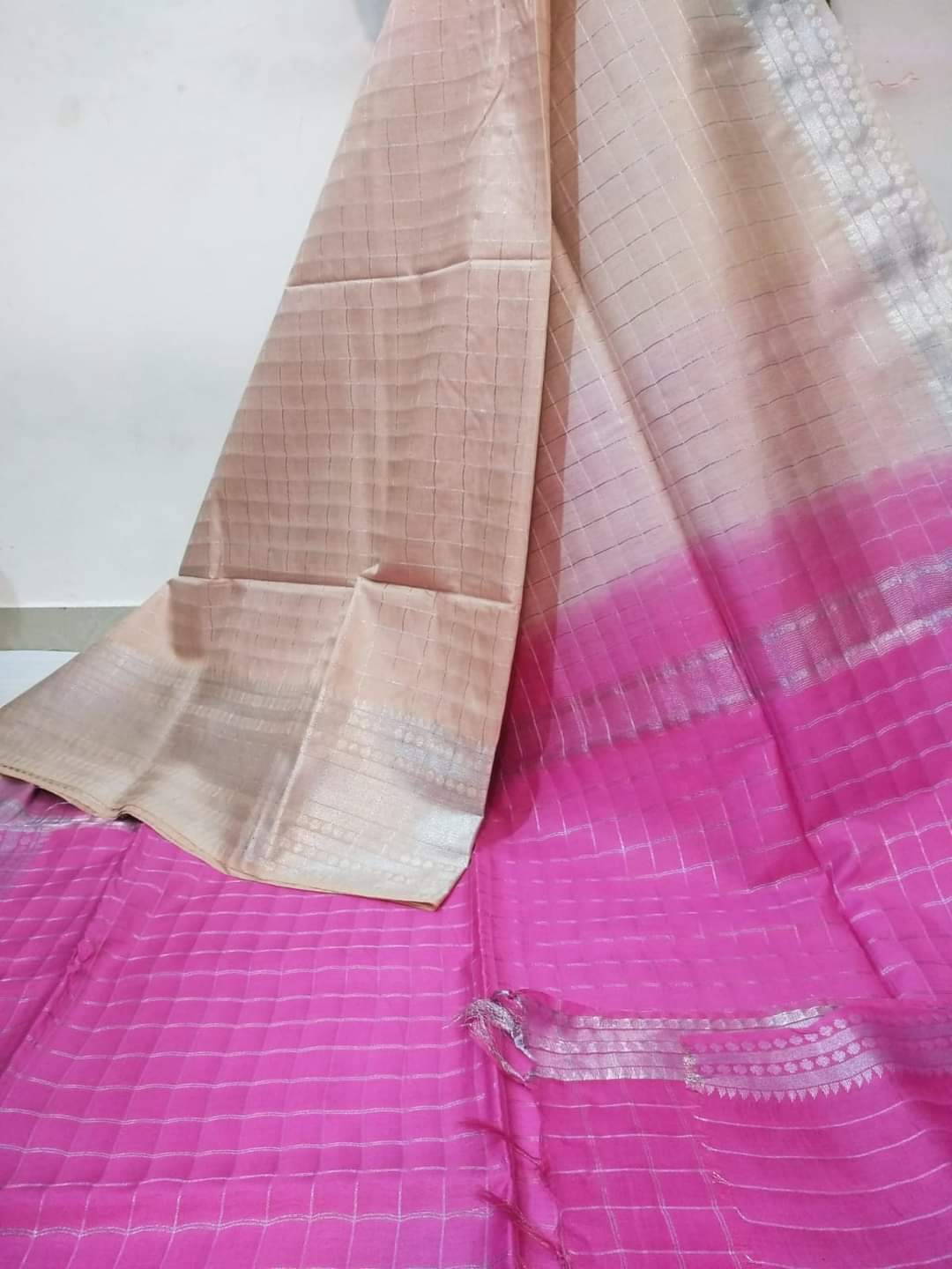 This elegant dual-tone handloom saree features a captivating checkered pattern in soft beige and vibrant pink hues. The subtle shimmer of the fabric adds a touch of sophistication, while the contrasting silver borders enhance its modern appeal. The handloom weave ensures a comfortable and breathable drape, making it perfect for both casual and semi-formal occasions. The unique color combination and delicate texture make this saree a versatile and stylish addition to your ethnic wardrobe.