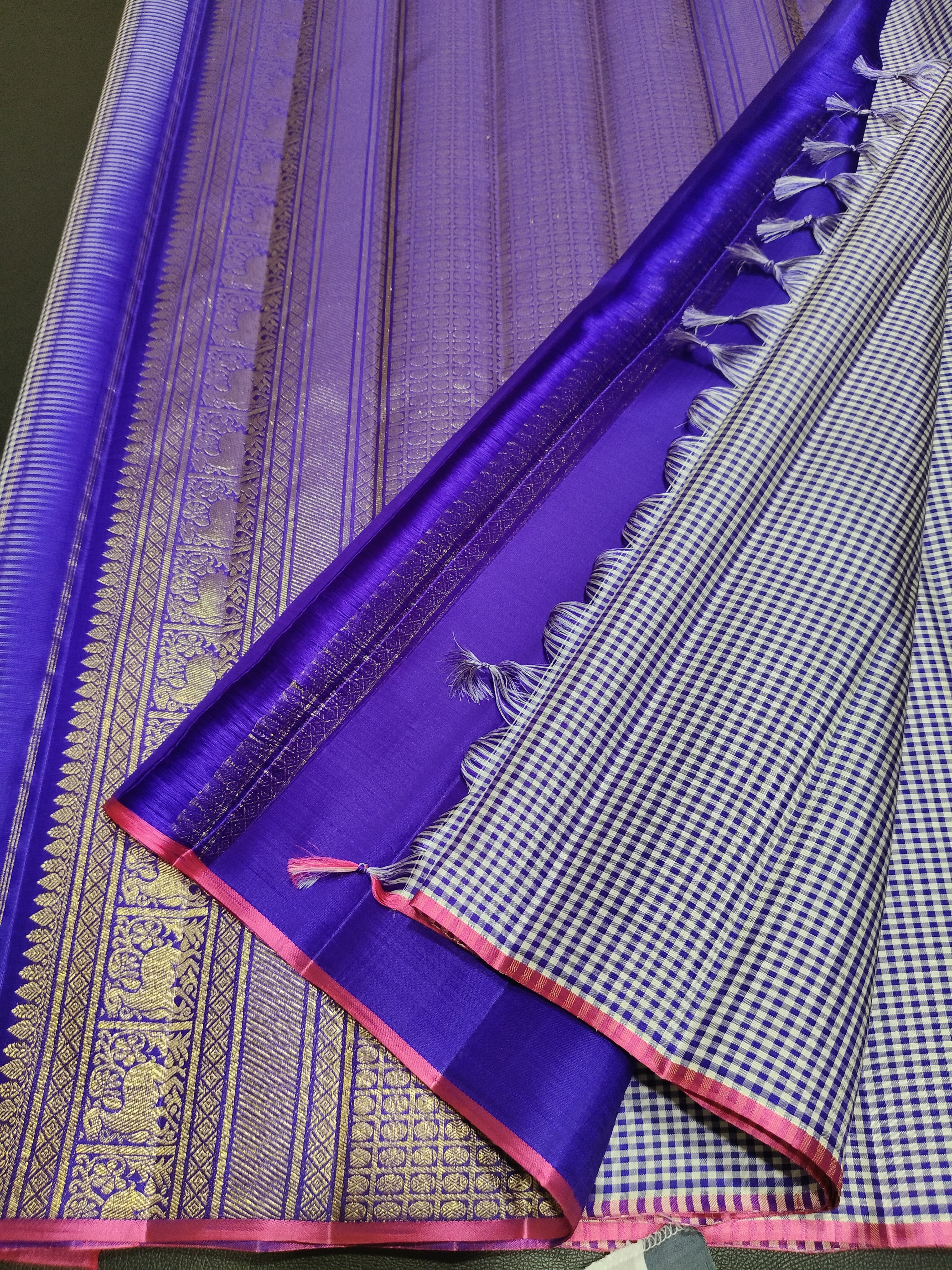 Experience the regal charm of this exquisite royal blue silk saree. This saree features a rich, vibrant royal blue hue, crafted from pure silk that lends a luxurious sheen and a smooth, elegant drape. The border is adorned with intricate gold zari work, showcasing traditional Indian craftsmanship.