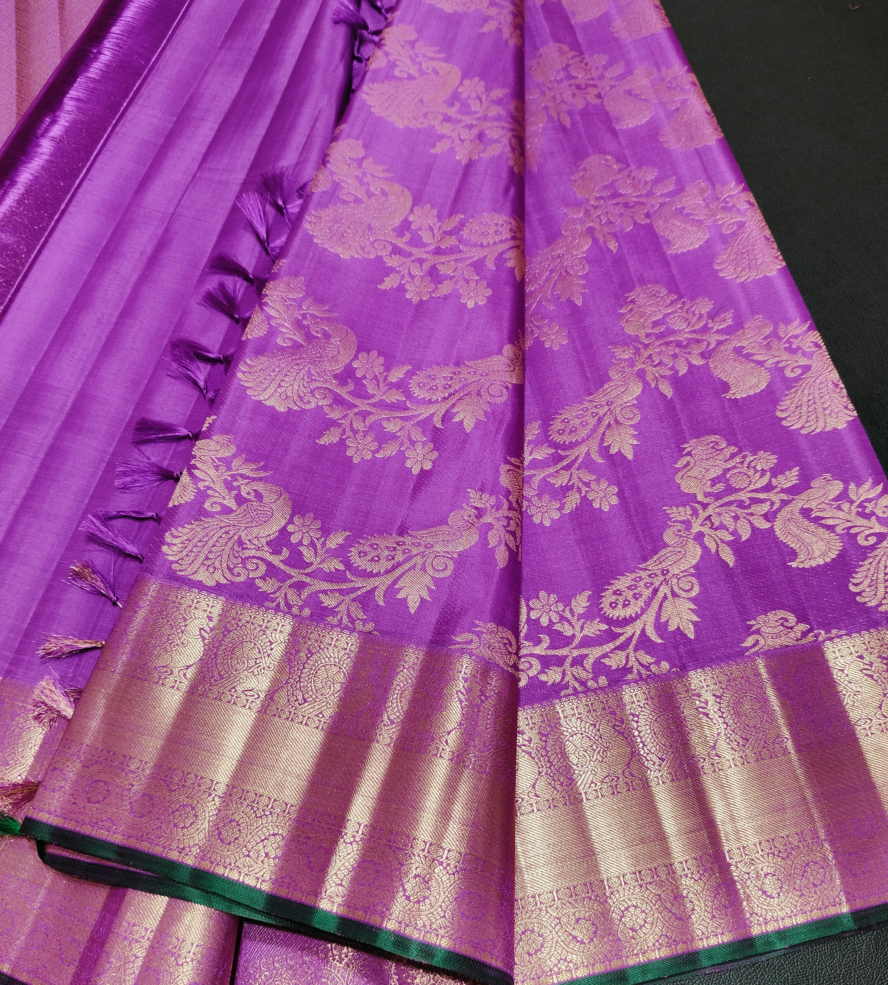 Indulge in the regal charm of this exquisite purple Banarasi silk saree. This saree features a captivating lavender or rich purple hue, crafted from pure Kanjivaram silk that offers a luxurious sheen and a smooth, elegant drape.