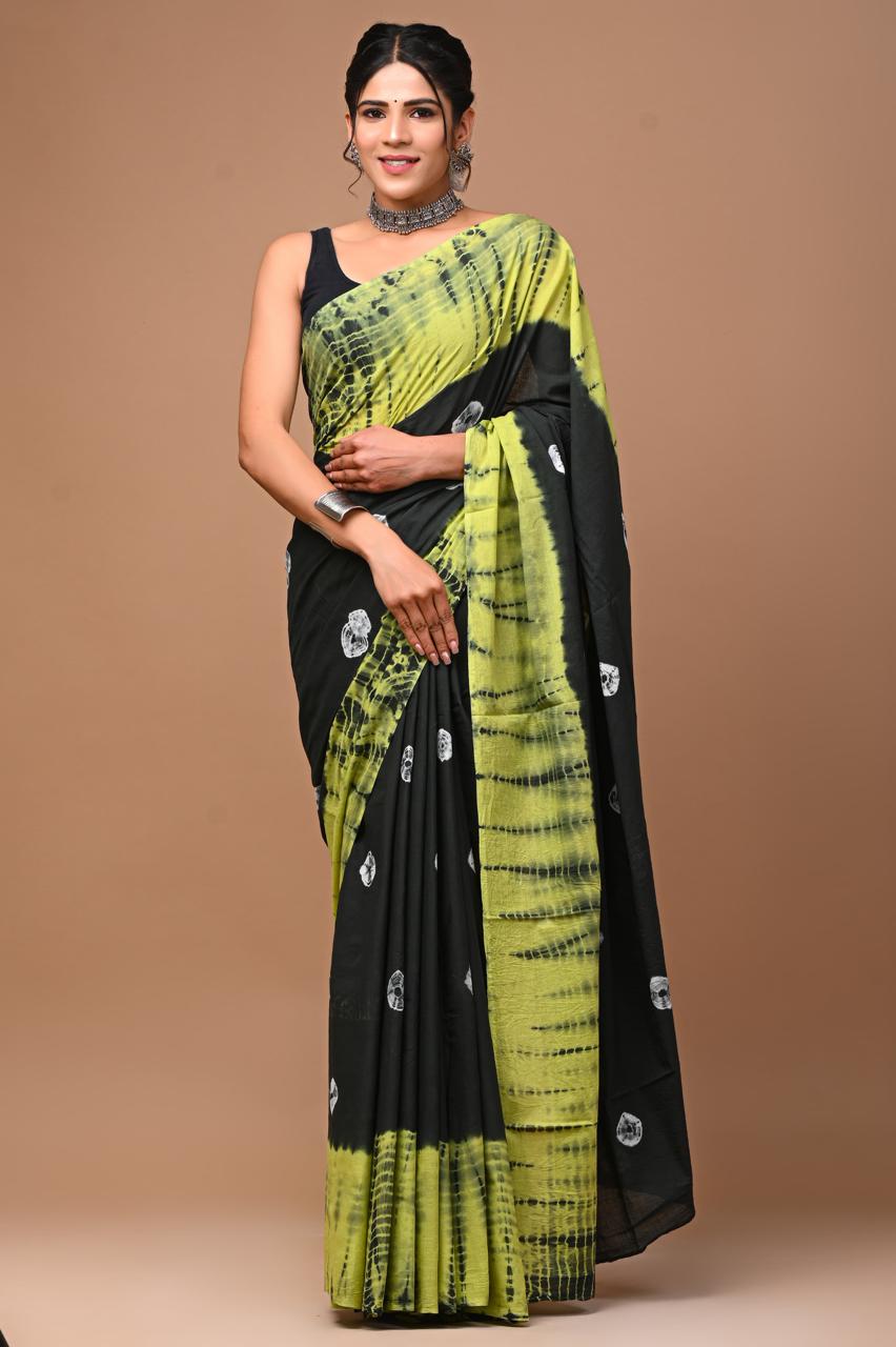 "Experience the unique charm of this black and green hand block print MulMul cotton saree. This saree features a striking combination of a deep black base with vibrant lime green accents, crafted from soft, lightweight MulMul cotton, perfect for comfortable all-day wear.