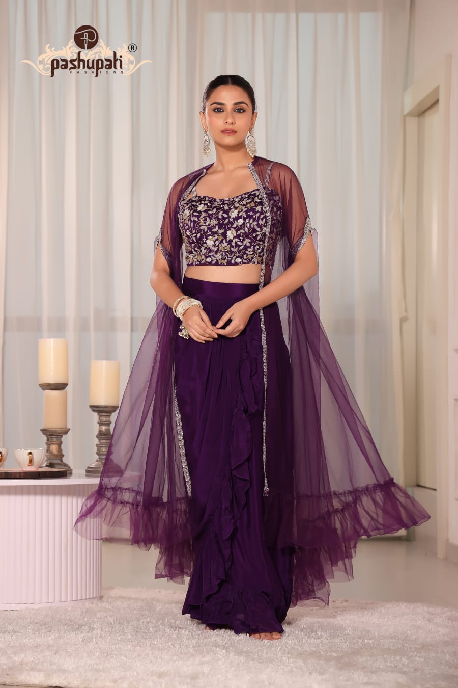 This stunning ensemble blends traditional and modern styles, featuring a richly embroidered blouse with intricate silver floral detailing. The deep purple ruffled saree drape adds a graceful and contemporary touch, while the sheer cape with delicate embellishments gives an ethereal, flowy look. Perfect for weddings, receptions, or festive celebrations, this outfit radiates sophistication and elegance.